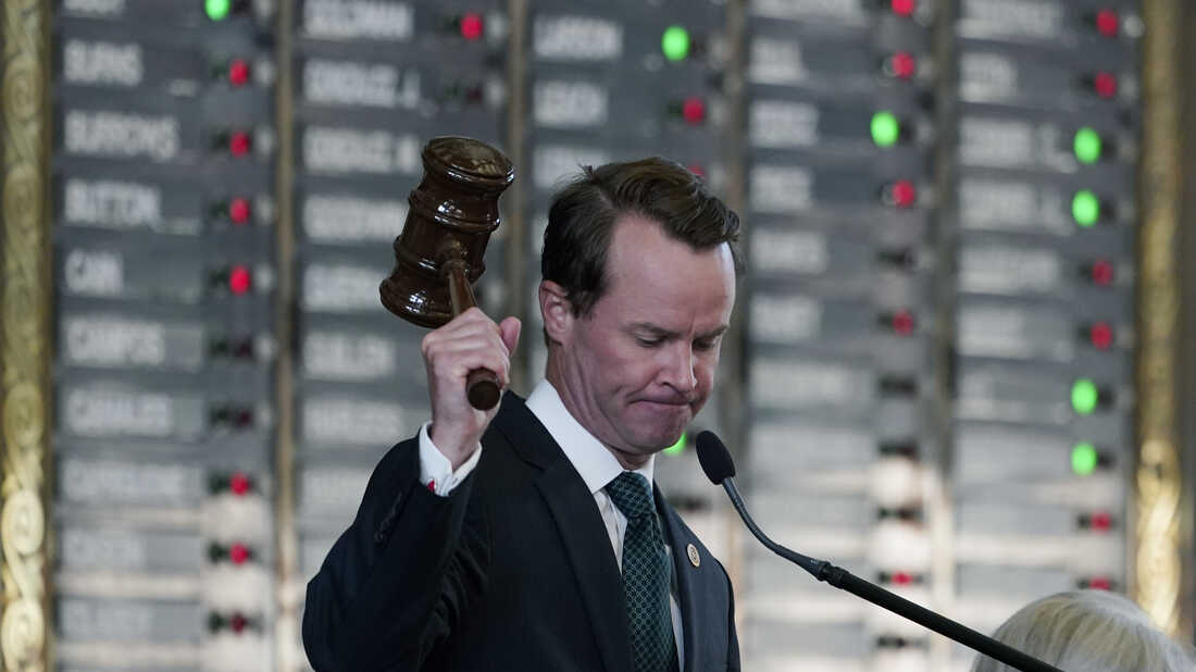 Texas Republican House Speaker Dade Phelan strikes his gavel as the House votes on an amendment to election bill SB1 on Thursday. The legislation easily passed in the GOP-led chamber. Eric Gay/AP hide caption