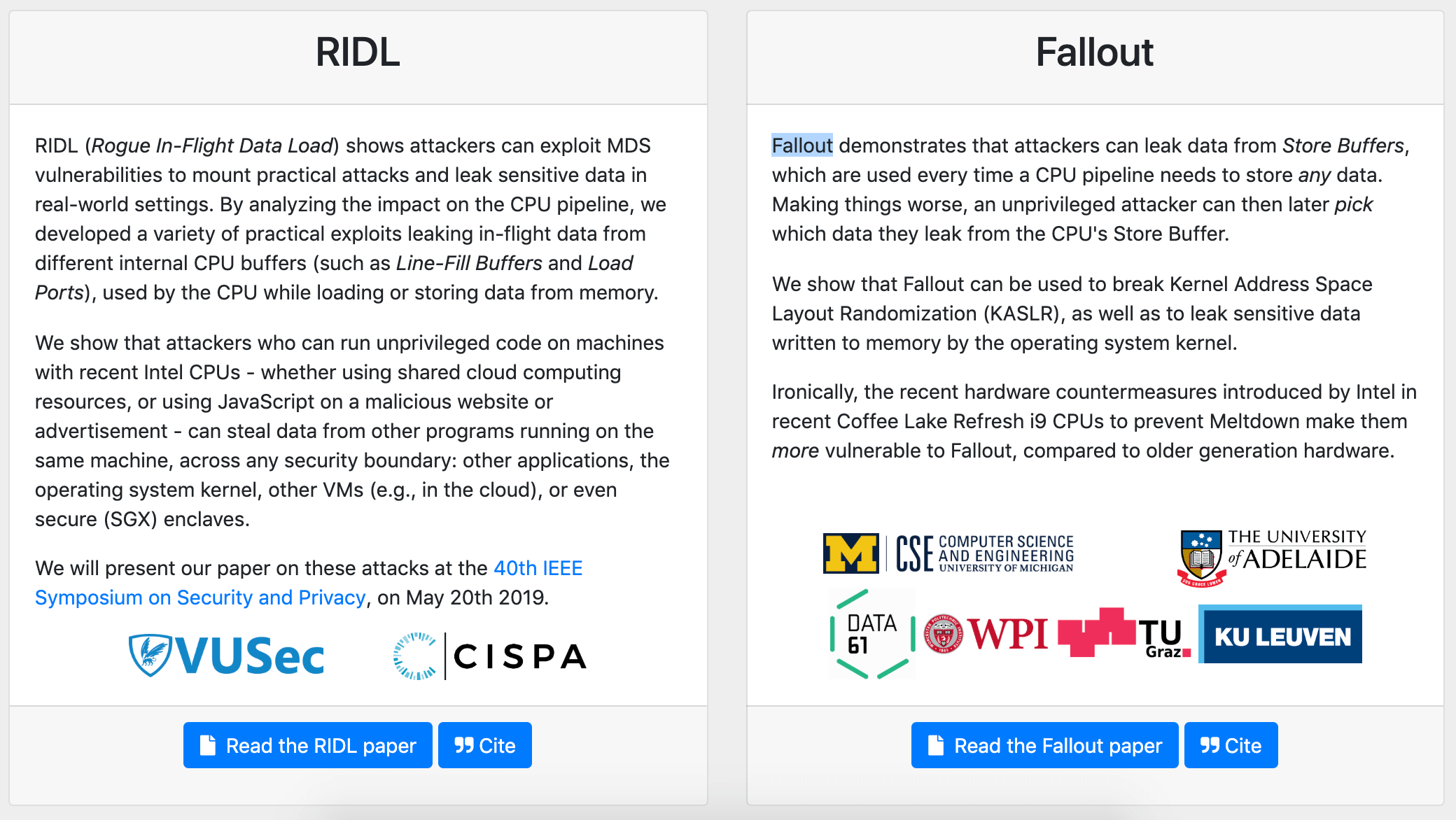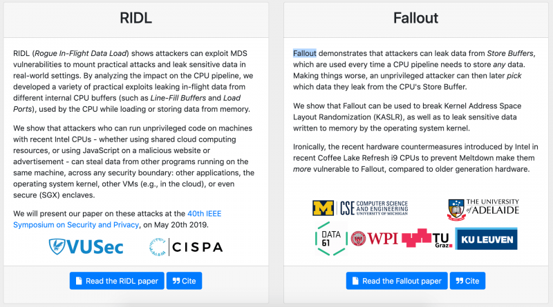 What nobody anticipated however is that speculative execution would open the door to many hard vulnerabilities that cannot be fixed outright but can be mitigated. According to RIDL (Rogue In-Flight Data Load) and Fallout’s informational website (also see, ZombieLoad), these new flaws allow attackers to leak confidential data by exploiting Microarchitectural Data Sampling (MDS) side-channel vulnerabilities in Intel CPUs. Unlike previous Meltdown, Spectre and Foreshadow CPU flaws, the leaks do not occur at the CPU cache level but target arbitrary in-flight data from CPU internal buffers. Qualcomm and AMD processors are not affected by these flaws.