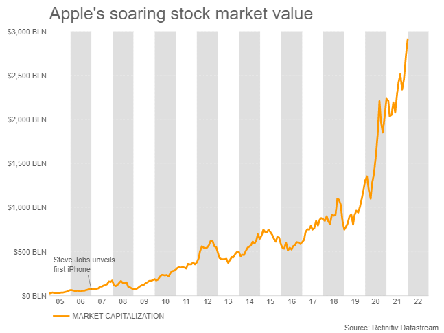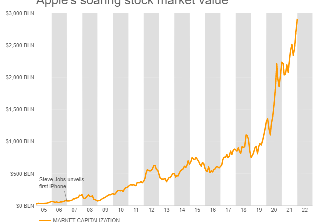 On the first day of trading in 2022, the Silicon Valley company’s shares hit an intraday record high of $182.88, putting Apple’s market value just above $3 trillion. The stock ended the session up 2.5% at $182.01, with Apple’s market capitalization at $2.99 trillion.