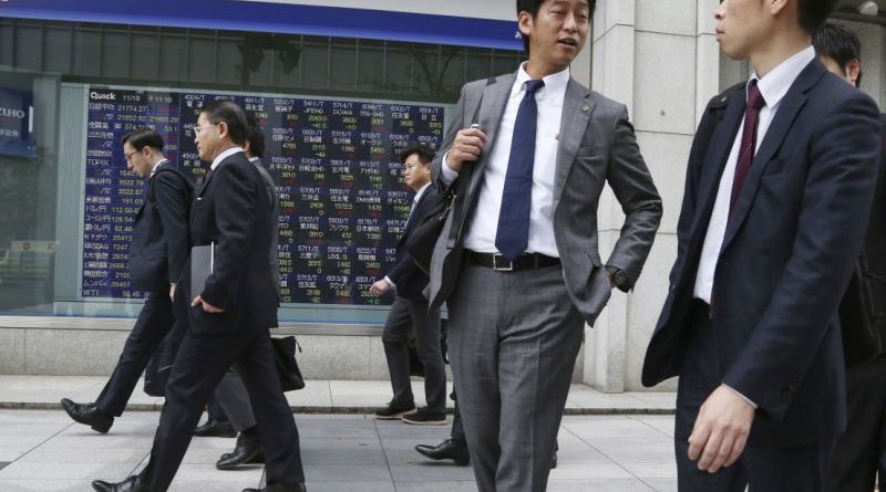 People walk by an electronic stock board of a securities firm in Tokyo, Monday, Nov. 19, 2018. Asian shares were mostly higher Monday after a buying spree on Wall Street kept up investor optimism into a new week, despite continuing worries about trade tensions. (AP Photo/Koji Sasahara)