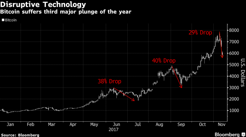 The cryptocurrency has dropped 5.6 percent since late Friday, and at one point extended its slide from last week’s record to as much as 29 percent. Bitcoin cash, a rival that split from the original bitcoin in August, has jumped 32 percent since Friday, according to data compiled by Coinmarketcap.com.