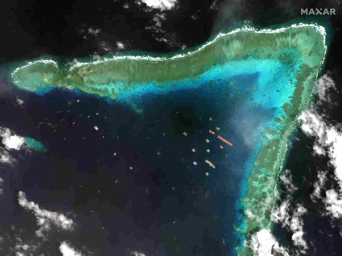 Satellite imagery obtained by NPR from Maxar Technologies shows Chinese vessels moored in the crook of the boomerang-shaped coral bar known as Whitsun Reef — also called Julian Filipe Reef in the Philippines and Niu’e Jiao in China. It lies 175 nautical miles west of the western Philippine province of Palawan, well within the country’s 200-mile exclusive economic zone.