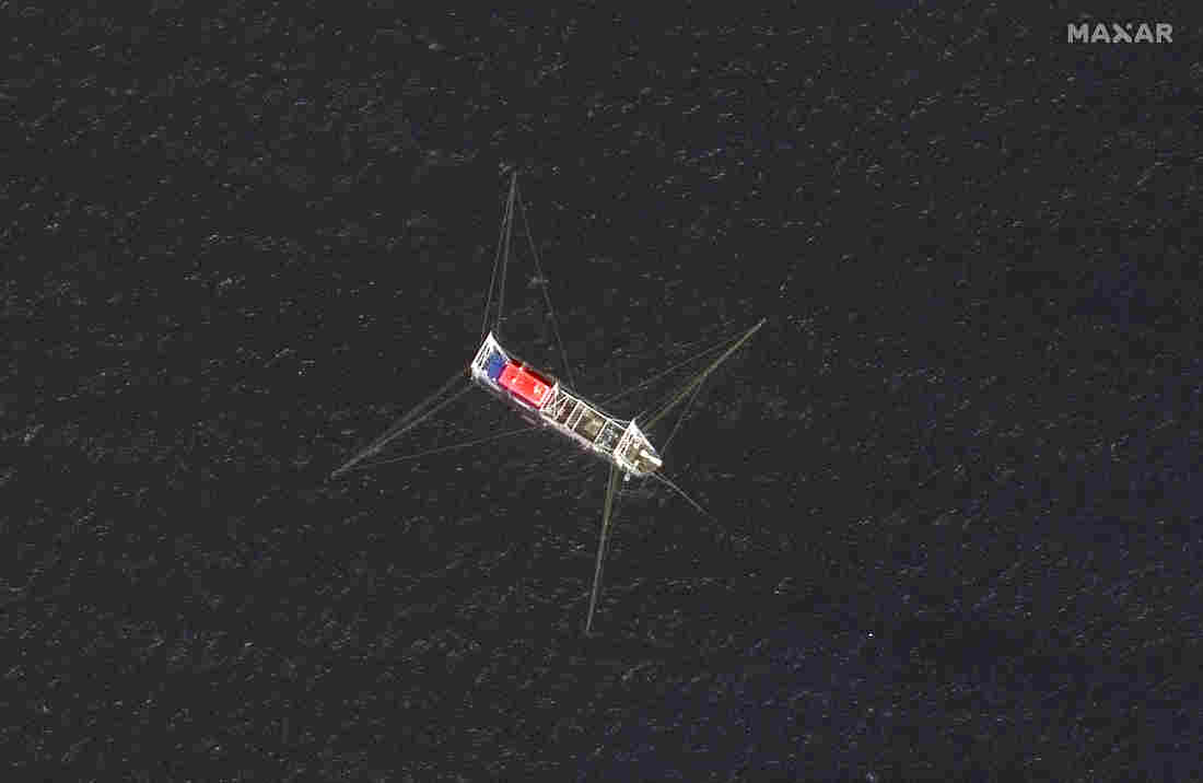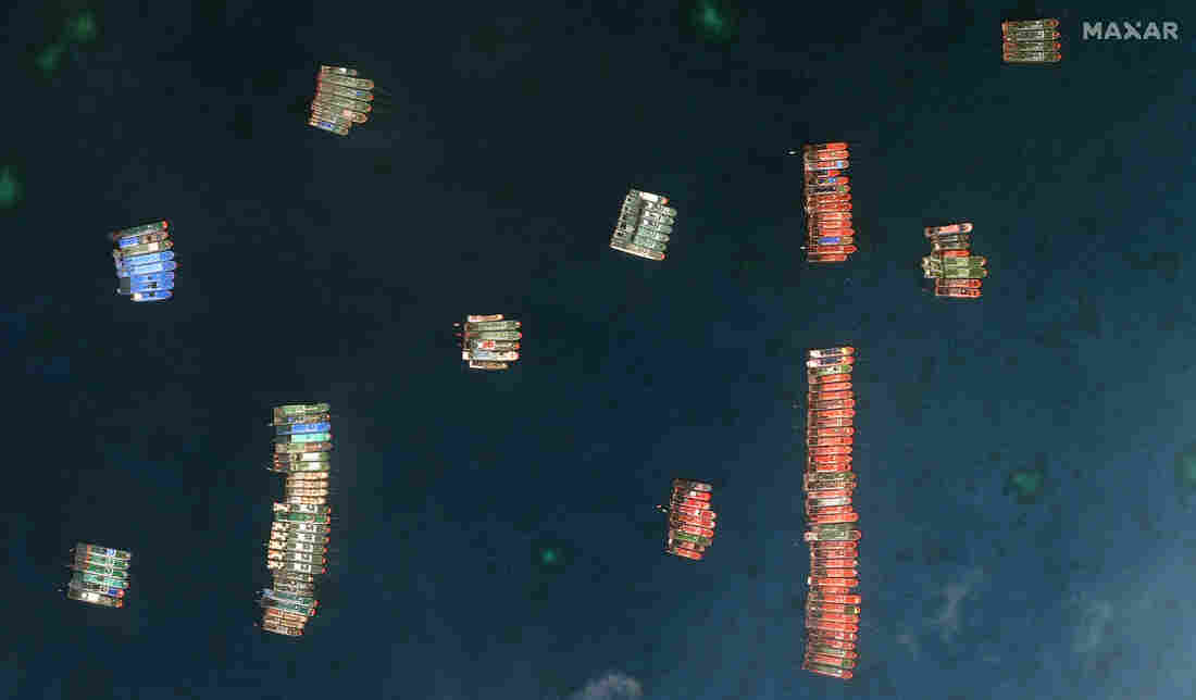 Gregory Poling says that’s suspicious. Poling runs the Asia Maritime Transparency Initiative at the Center for Strategic and International Studies, a Washington, D.C.-based think tank. He says the boats, tied up “with military precision” beside each other, “are not fishing,” they’re parked.