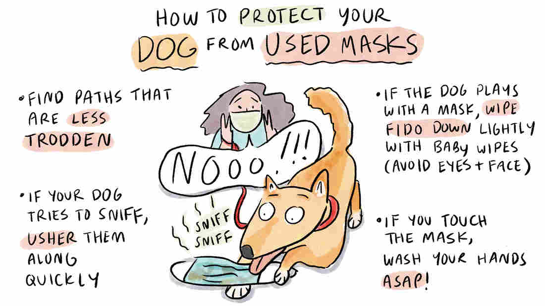 One idea is to look for dog paths or less crowded streets to walk your dog where litter is less or a problem. If you do see your dog sniffing on a mask, Varble says, usher them away from the area as quickly as possible. Do your best not to make contact with the mask directly.