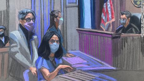 Maxwell entered the New York courtroom in a dark blue prison outfit with her ankles shackled and her hair, now slightly grayed at the roots, hanging just below her shoulders. She wore a mask, except when she drank water from a plastic bottle.