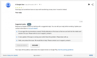 The new system will auto-generate three responses for app developers, which will be based on the content of the user comment – developers can choose to select any reply and send it as is, choose to customize it, or come up with a new response from scratch. The replies feature is currently available only in English, but Google says more languages will be added in the future.