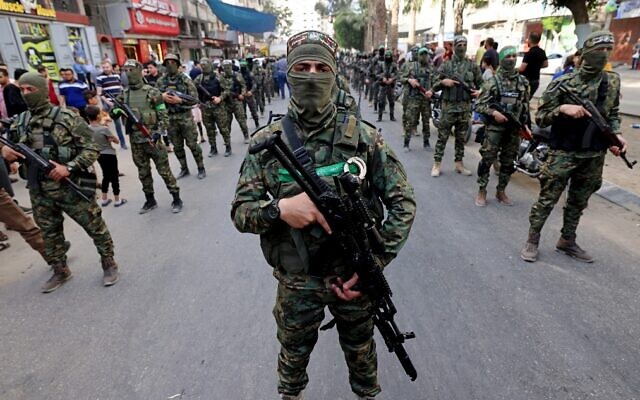 Members of the Izz-Al Din Al-Qassam Brigades, the armed wing of the Hamas terror group, march in Gaza City on May 22, 2021. (Emmanuel Dunand/AFP)