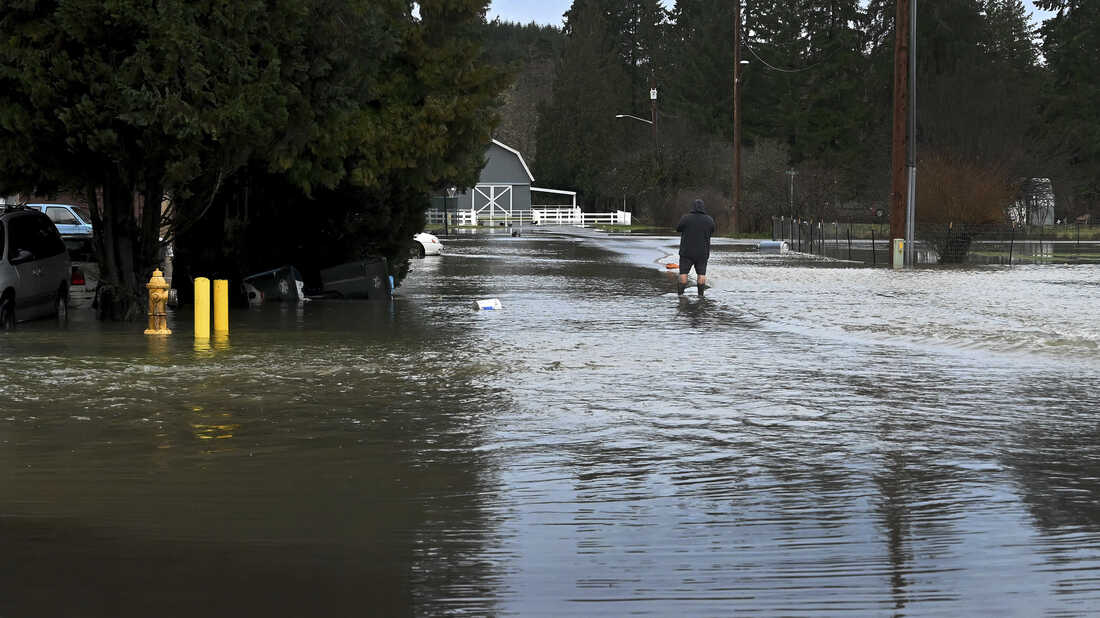 A man wades through rising water from the nearby Skookumchuck River to take a photo in the town of Bucoda, Wash., Friday, as area rivers and snow runoff begin to accelerate flooding in the south sound.