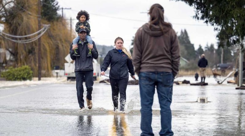 Reggie Brown, of Centralia, carries his daughter, Ocean, 4, on his shoulders as he walks through the floodwaters on Highway 507 with his wife, Jonell Brown, on Friday in Centralia, Wash. The highway had flooded after heavy rains caused the Skookumchuck River to rise about its northern banks.