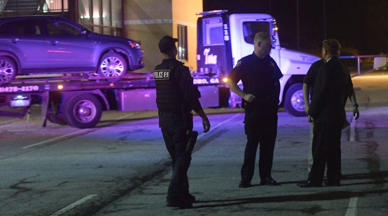 Law enforcement officers talk as a car is towed away in the Mt. Zion High School parking lot as part of an investigation into a shooting Friday, May 18, 2018, in Jonesboro, Ga. The lot was being used as an overflow lot for the Perry Learning Center Graduation when the incident occurred. One person was killed and another wounded when an argument led to a shooting outside a high school graduation ceremony Friday night in metro Atlanta, police said. (AP Photo/John Amis)