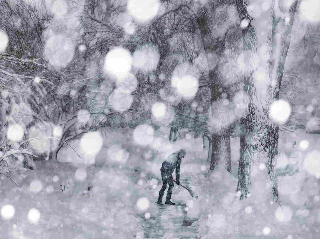 Kathy Gomez shovels her sidewalk on Sunday in Denver. Around 2,000 flights in and out of Denver have been canceled this weekend and highways around the state have been closed down as a winter storm pummels Colorado and neighboring states. Michael Ciaglo/Getty Images hide caption