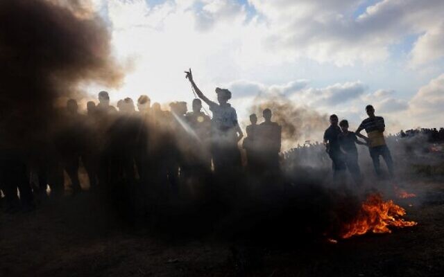 A few protestors held slingshots, while others burned tires and rolled them toward the border, setting off clouds of smoke. But most of the demonstrators appeared to stay back, remaining a few hundred meters from the barrier dividing the enclave from Israel.