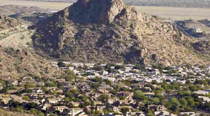 A housing development sits nestled in the South Mountain foothills in the Ahwatukee neighborhood, in Phoenix, Ariz. The city saw the biggest jump in population in the U.S. between 2017 and 2018. Ross D. Franklin/AP hide caption