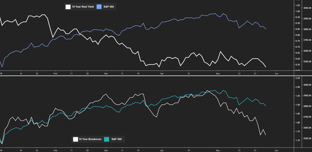 When you think about this, do note that what’s changed lately is that breakevens have fallen sharply since late last month. All year long, casual observers pointed to the disconnect between equities and bond yields and insisted that “something had to give”. Over that period, declining real yields were bolstering risk appetite, while rising breakevens (in tandem with crude prices) made a case for stabilizing growth expectations. Recently, however, breakevens have led the way lower for yields, and that isn’t something stocks are prepared to stomach given what it says about growth.