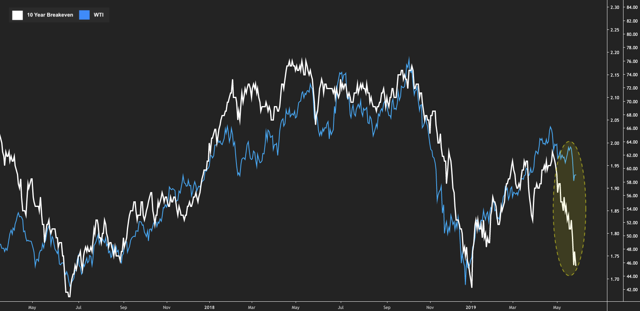 It’s also worth noting that this isn’t just down to oil. Sure, crude has sold off recently on global growth jitters (despite persistent supply concerns tied to Venezuela and Iran), but the rapidity of the drop in breakevens outpaces the declines in crude.