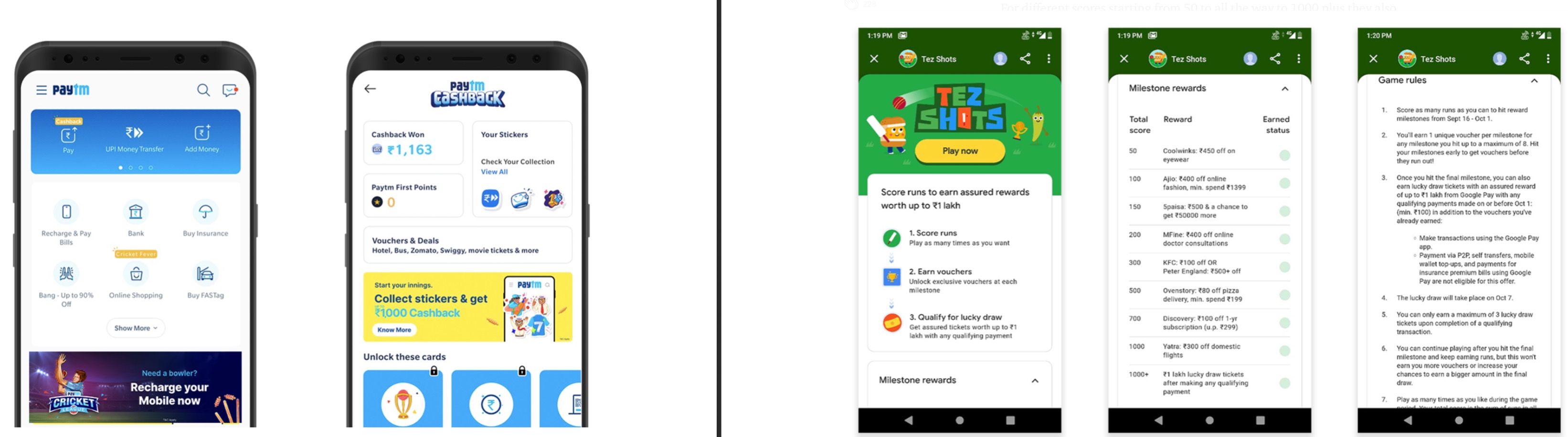 Cricket-themed cashback offered by Paytm (left) and Google Pay (right) in India