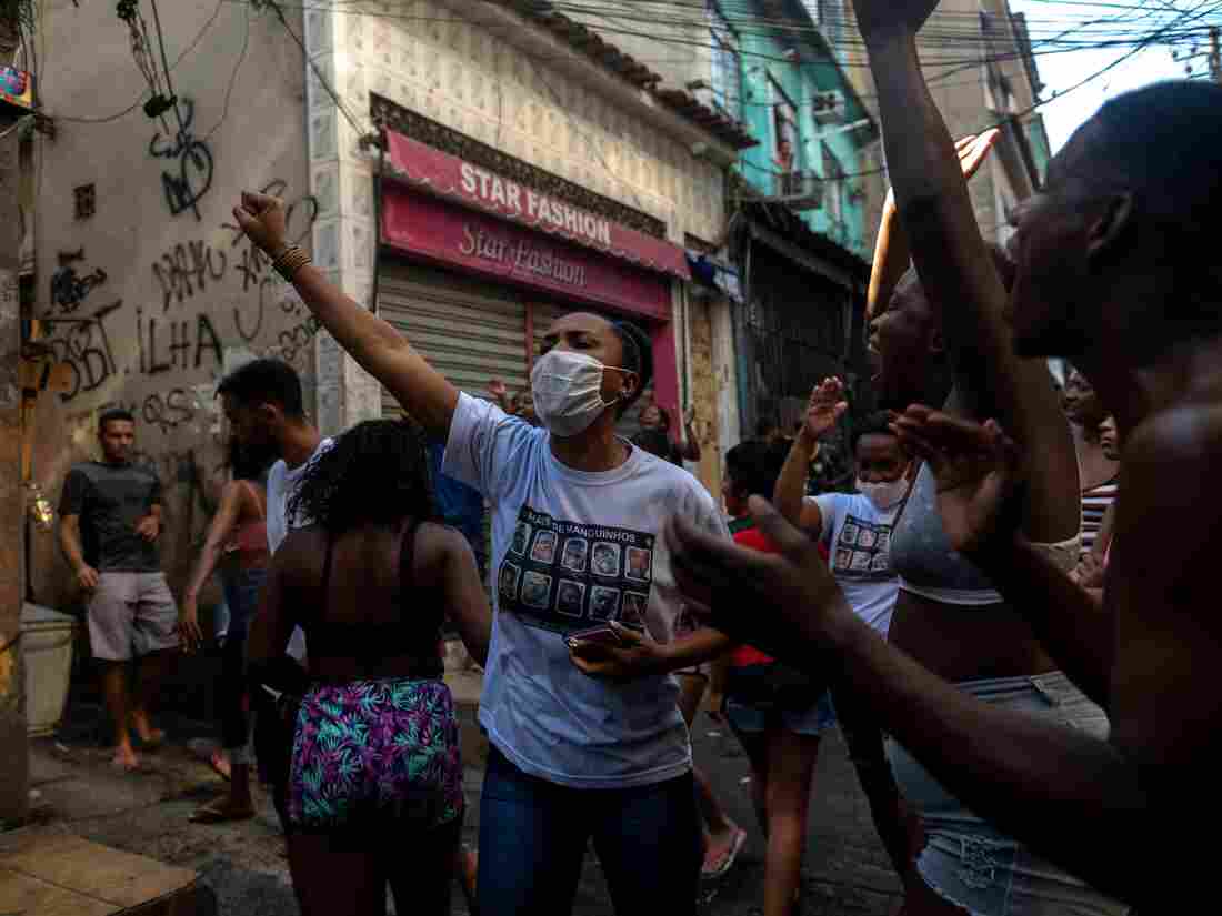 Residentes protest after a police operation against alleged drug traffickers at the Jacarezinho favela in Rio de Janeiro, Brazil, on Thursday. Mauro Pimentel/AFP via Getty Images hide caption